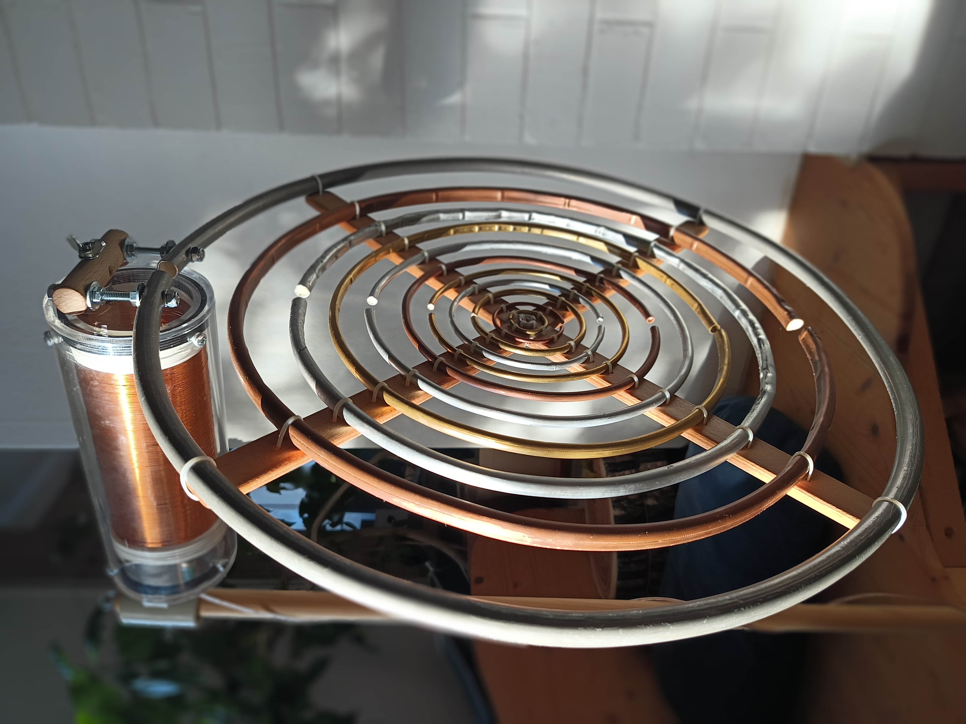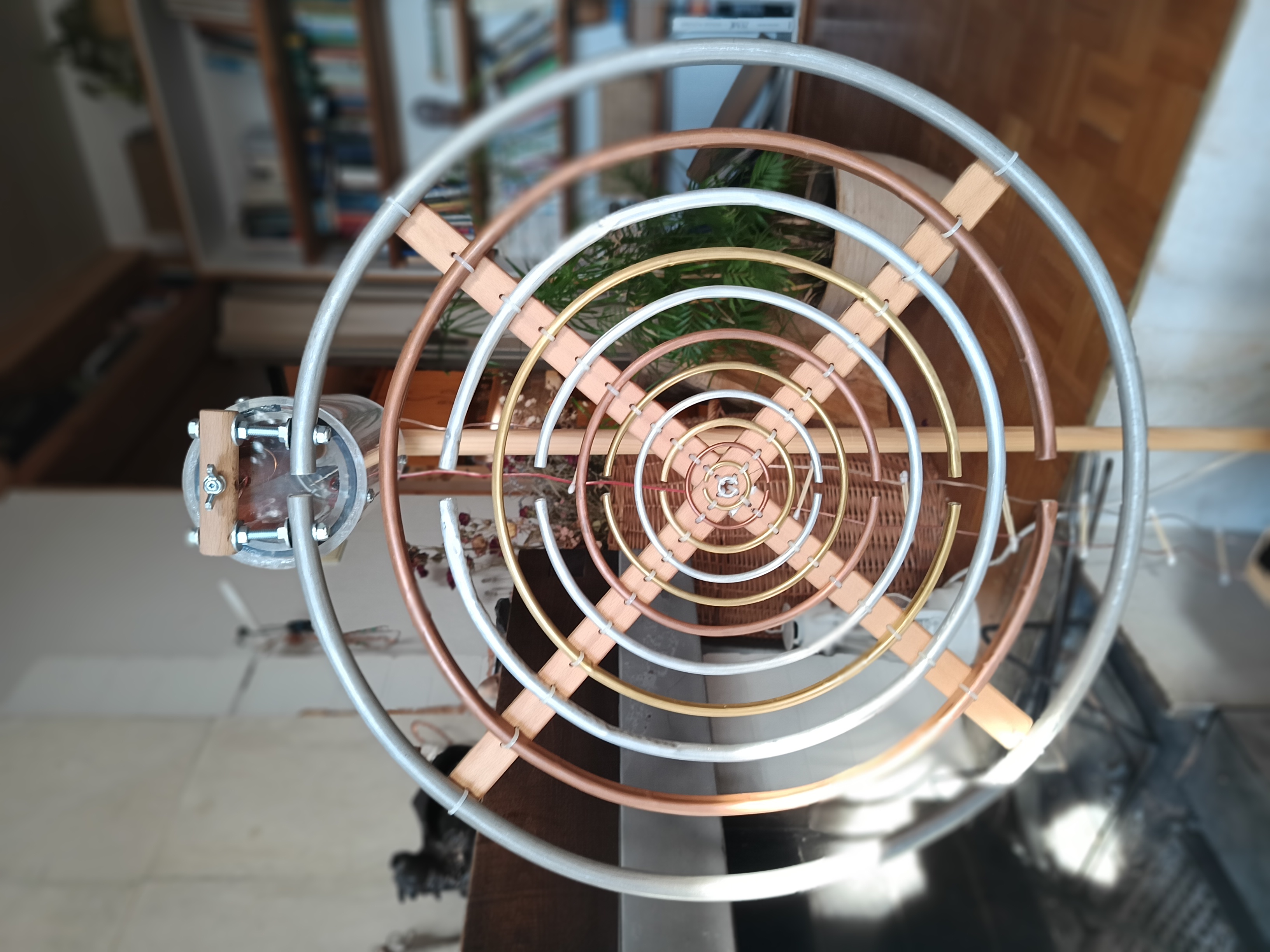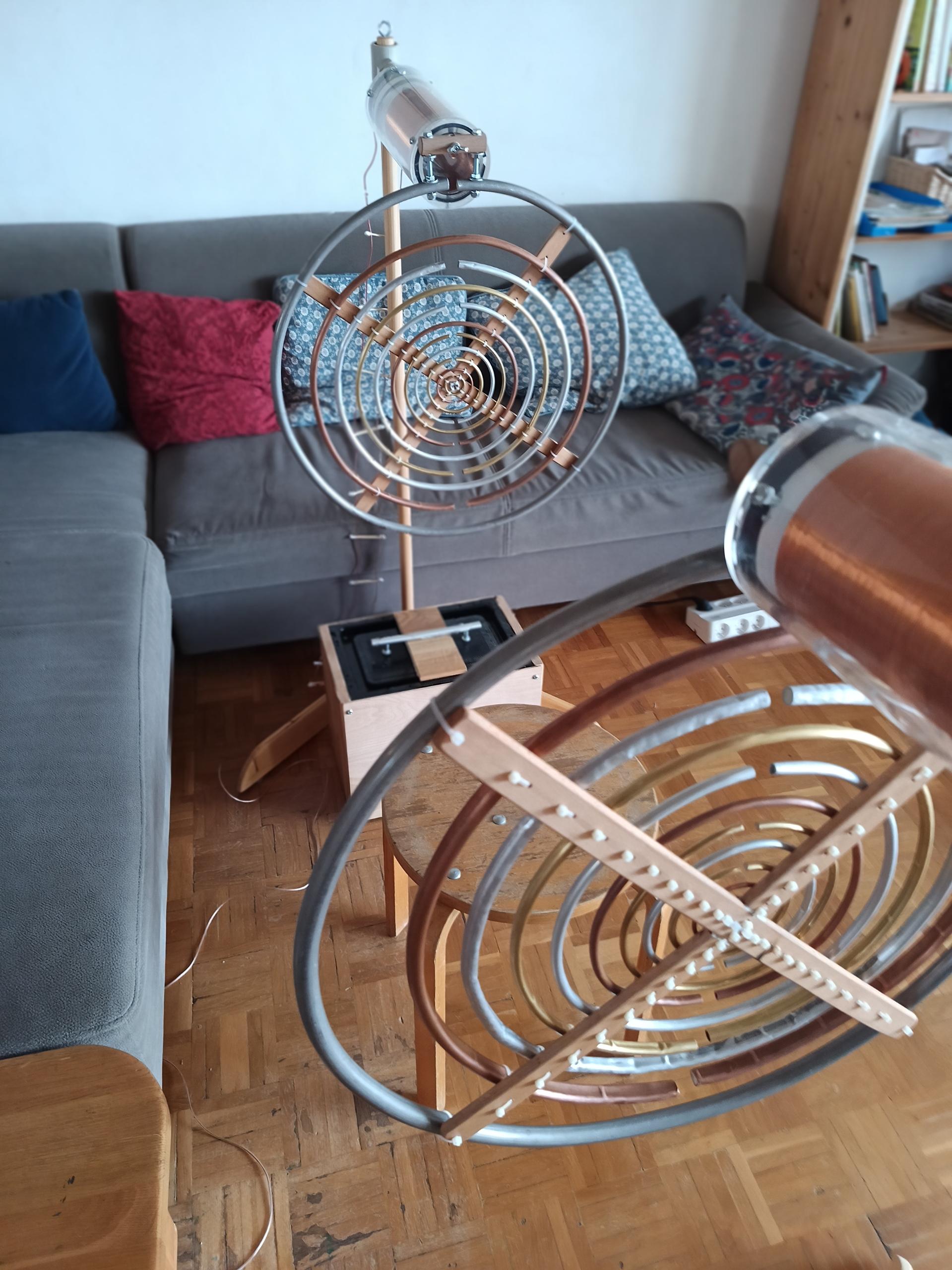 Vnitřní cívka je pak opatřena na vnějších koncích nalepeným dveřním těsněním (tlustým 4 mm a širokým 1 cm) a dvěma vruty přichycena do nosné bukové tyče ramene. Potom je vnořena do vnější trubky. Obě trubky jsou spojeny na krajích trojicí 5 mm šroubů.
