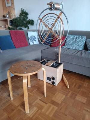 Celou sekundární cívku vysílače jsem od jednoho konce k druhému postupně utáhl a závity vyrovnal vedle sebe a mezi primární a sekundární cívkou zrušil tak 2 metry sekundárního vinutí, aby tam vznikla mezera. Ubylo asi 15 sekundárních závitů, takže jich zbylo kolem 260. Cívku přijímače jsem nechal v původním stavu s více sekundárními závity, protože jsem tam nepozoroval vysoká napětí a problémy s nechtěnými výboji. Nakonec po zapnutí takto upravené cívky vše jede, jak má.Anténní prstence mi blízká firma na ohýbání trubek nevyrobí, protože po několikaměsíčním uhánění nebyli schopní dodat nějakou nabídku proveditelnosti. Zbývá mi tedy domácí výroba. Nejdříve šablonu kruhů ze dřeva a pak ohnutí trubek podle ní …