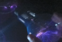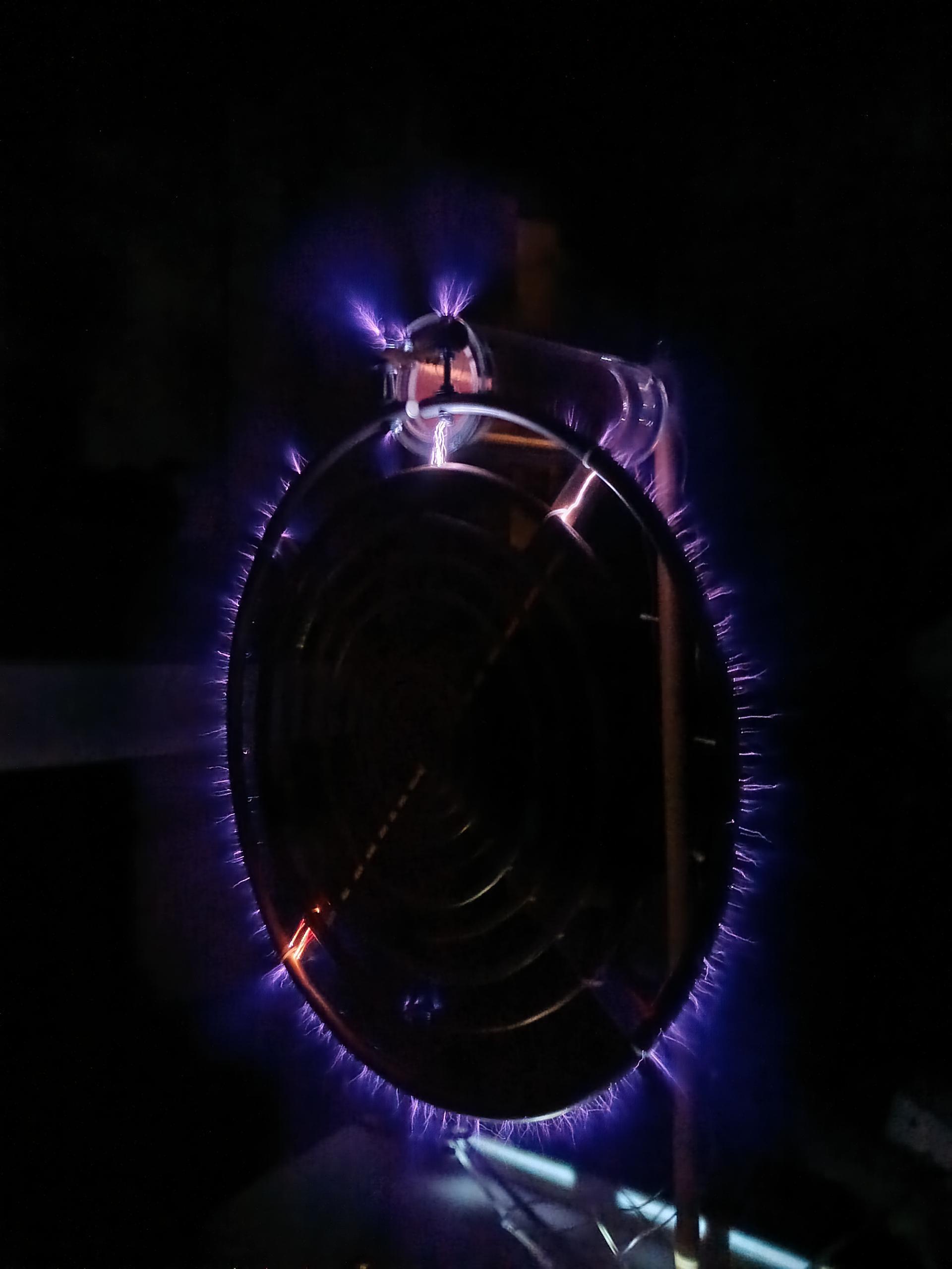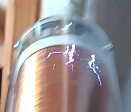 Žárovka se prozářila jemnými fialovými výboji, podobně jako má plazmová koule, která se dá běžně koupit, ale s tím rozdílem, že při větším přiblížení ke konci cívky se intenzita zvětšila a začaly probíjet miniblesky do bíla a pak to celé probíjelo do ruky přes sklo žárovky a ruka se rozbrněla. Ne nic intenzivního, dá se to vydržet