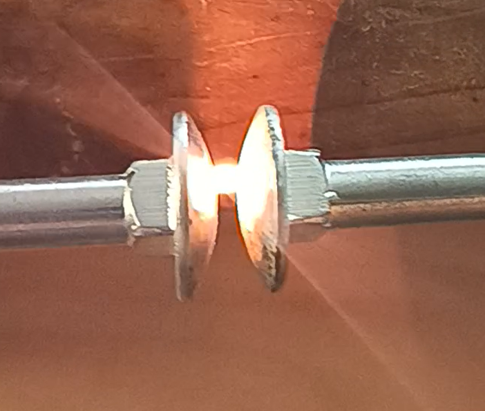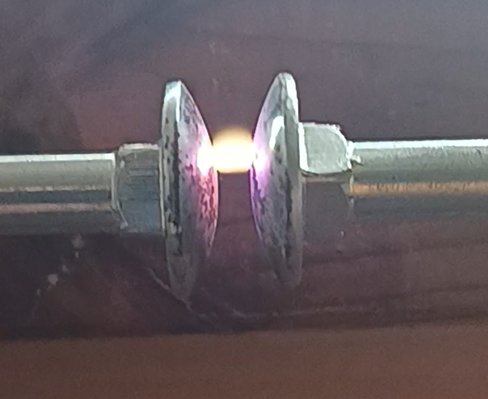 Problém je v tom, že po zapnutí generátoru sice probíhá modrofialový výboj v jiskřišti, ale transformátor se hodně hřeje a po několika sekundách se začne přehřívat. Když dám šrouby jiskřiště dál od sebe, viditelný výboj neproběhne. Asi by pomohl nějaký omezovač výkonu…