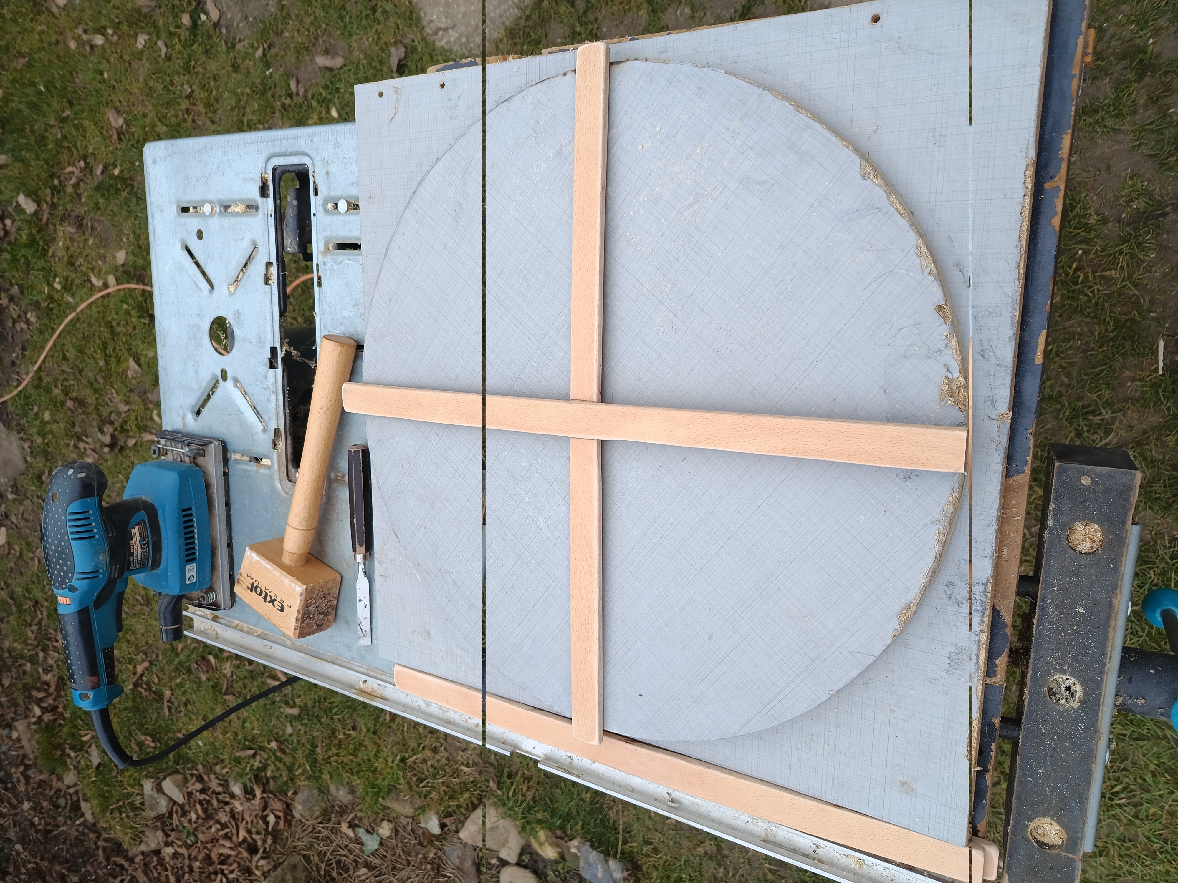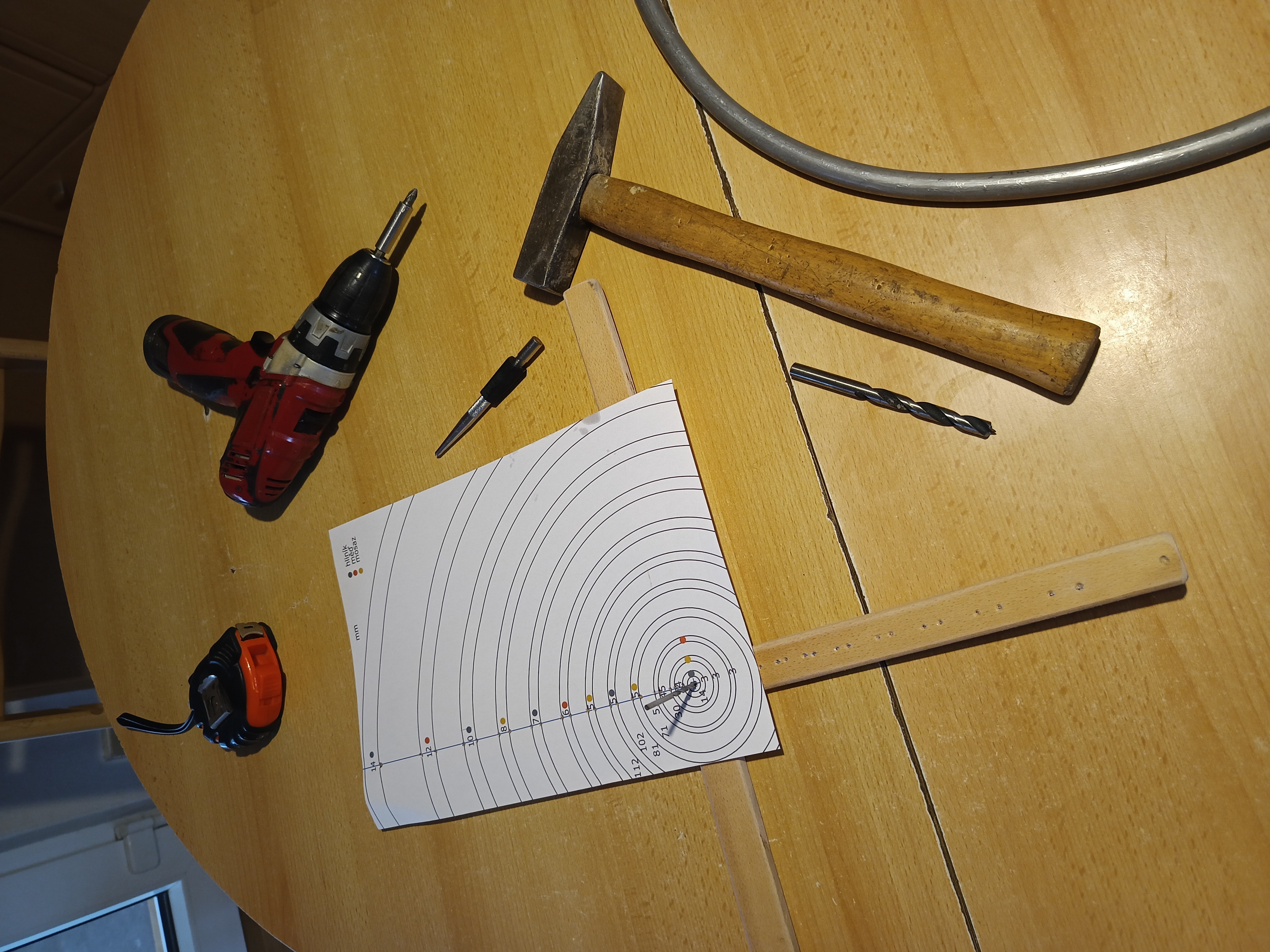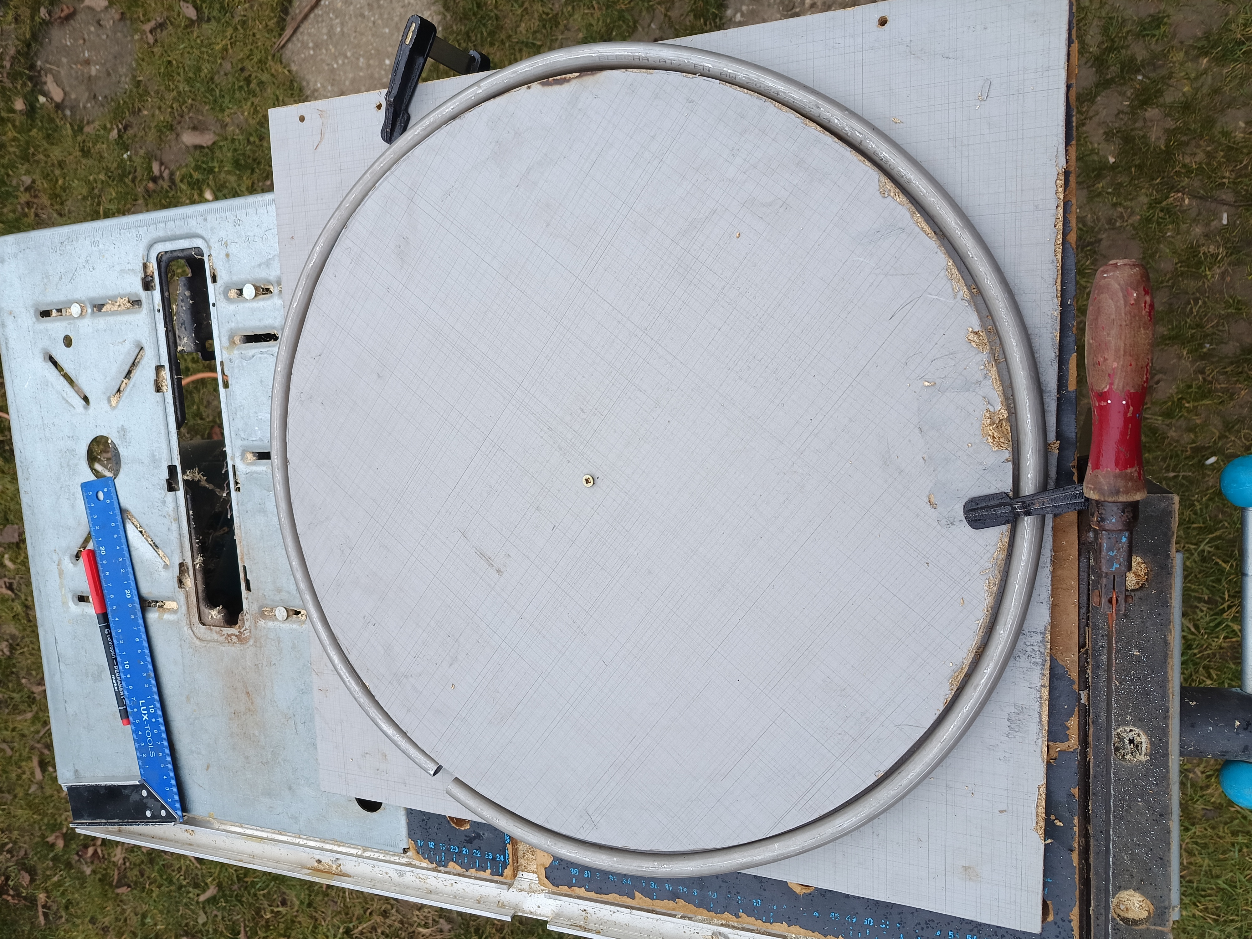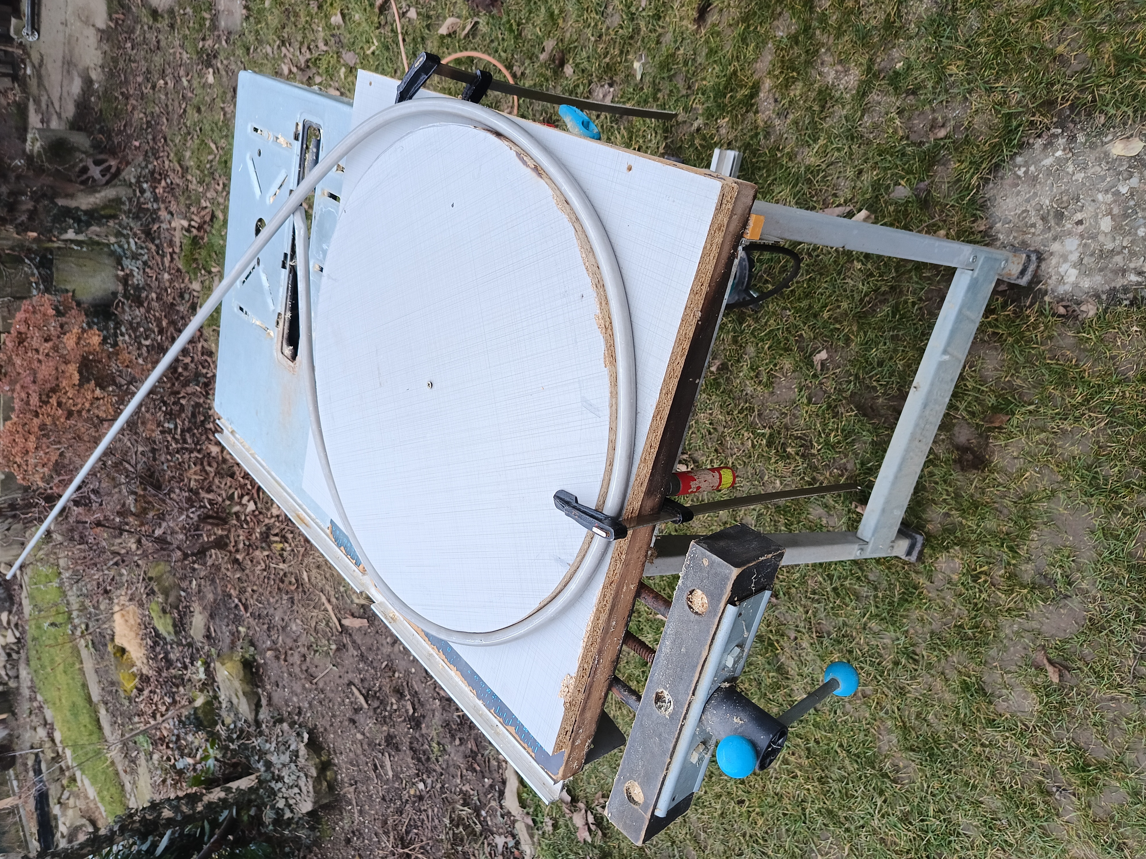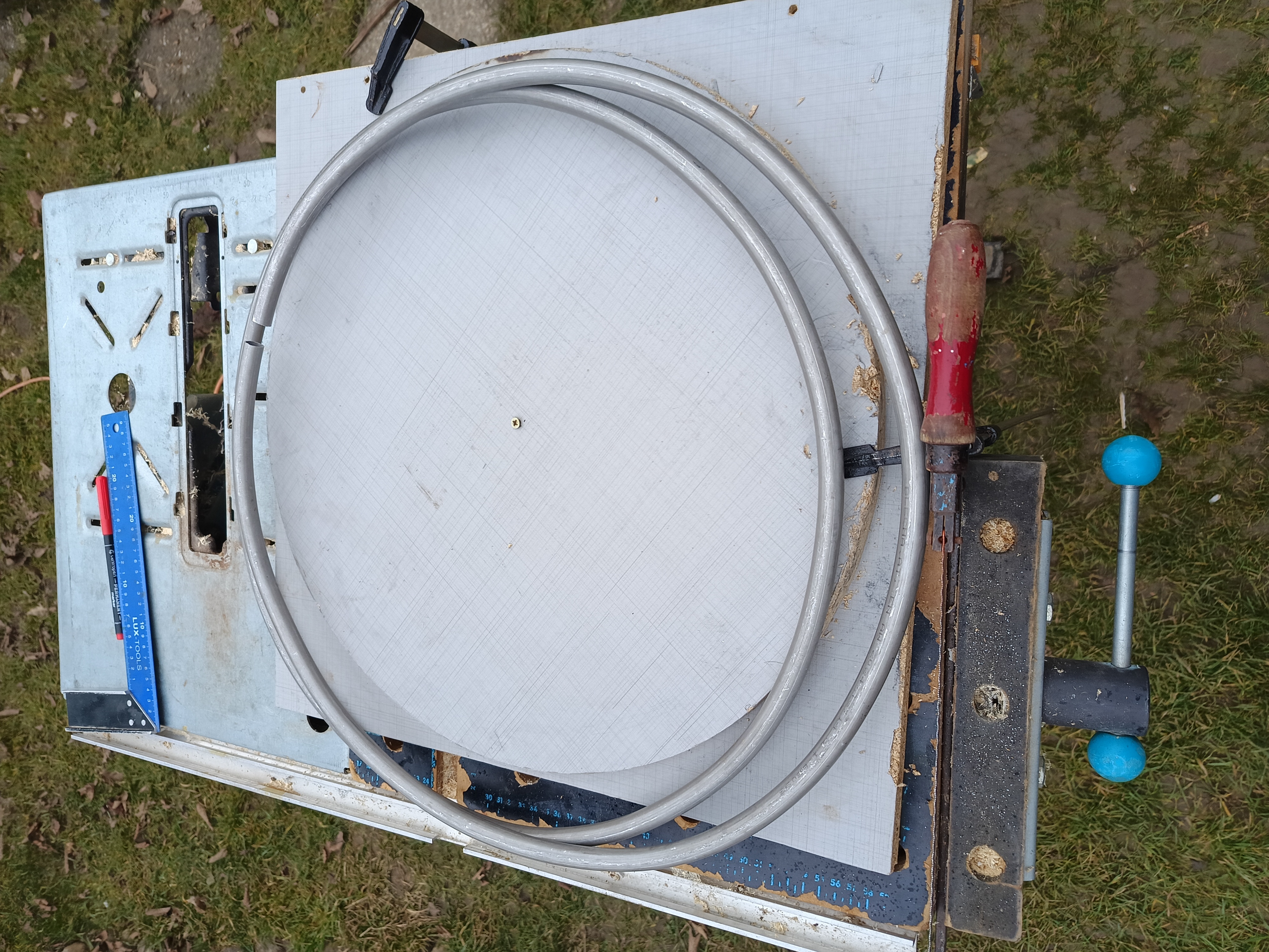 Na největší tvrdou hliníkovou trubku už nebylo i tak v ohýbačce místo a tak jsem si vyřezal z dřevotřísky kruh o vnitřním průměru tohoto posledního prstence, uprostřed ho přišrouboval k o něco většímu čtverci a ten si připnul na pracovní stůl 2 svěrkami. Do jedné z nich jsem zasunul konec trubky a postupně rukou ohýbal podle dřevěného kruhu. Pružilo to a tak jsem musel ohýbat víc a postupně delší dobu formovat kruh.