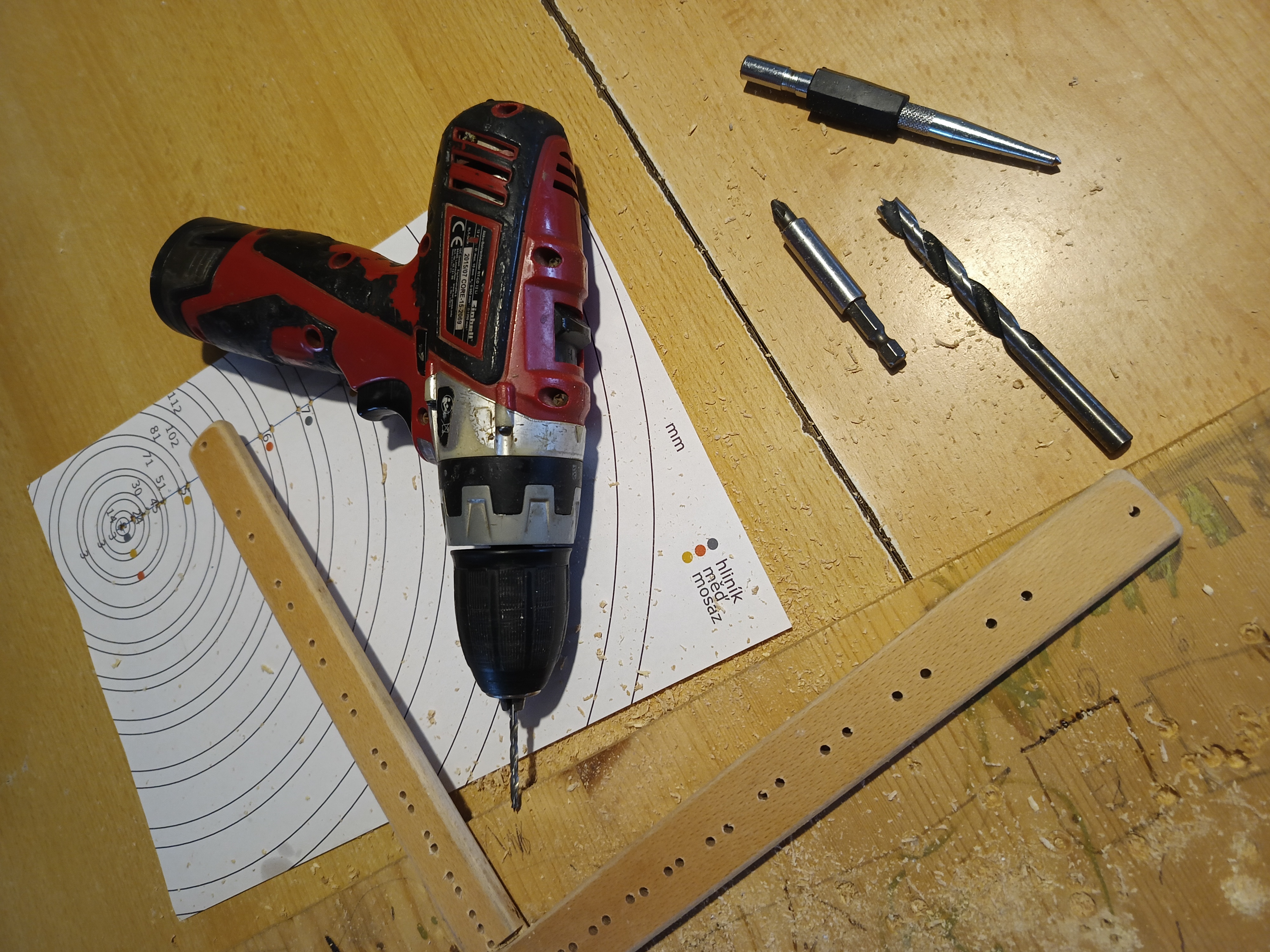 Ze dvou dubových mírně ohnutých lamel ze starého postelového roštu jsem připravil dva kříže na upevnění kruhů. Rozřezal jsem lamely na půl podélně, obrousil a uprostřed vyřezal a dlátem vydlabal do půlky, abych je po dvojicích slepil do 2 křížů o kousek menších než největší prstenec. Podle šablony jsem na ně nakreslil středy 3 mm dírek, které jsem pak vyvrtal. Nakonec jsem je natřel lněným olejem.
