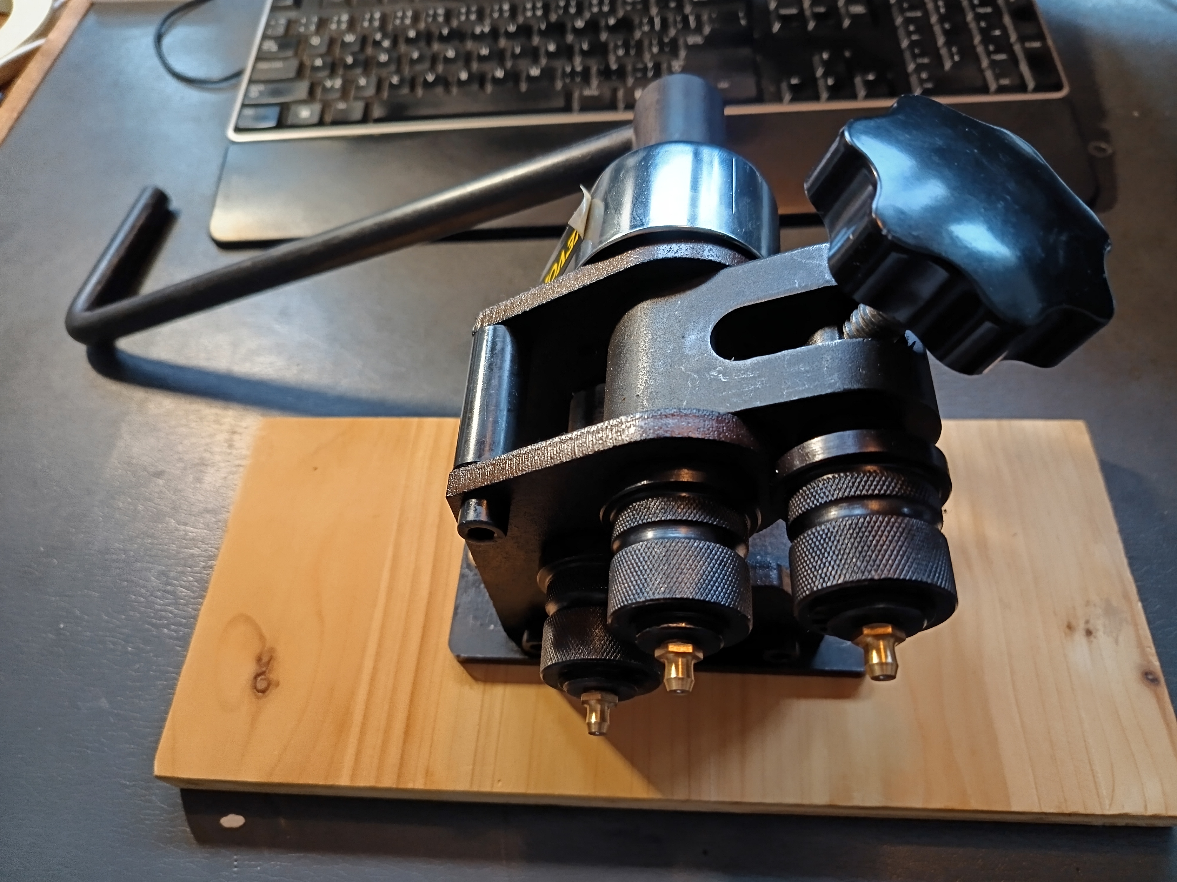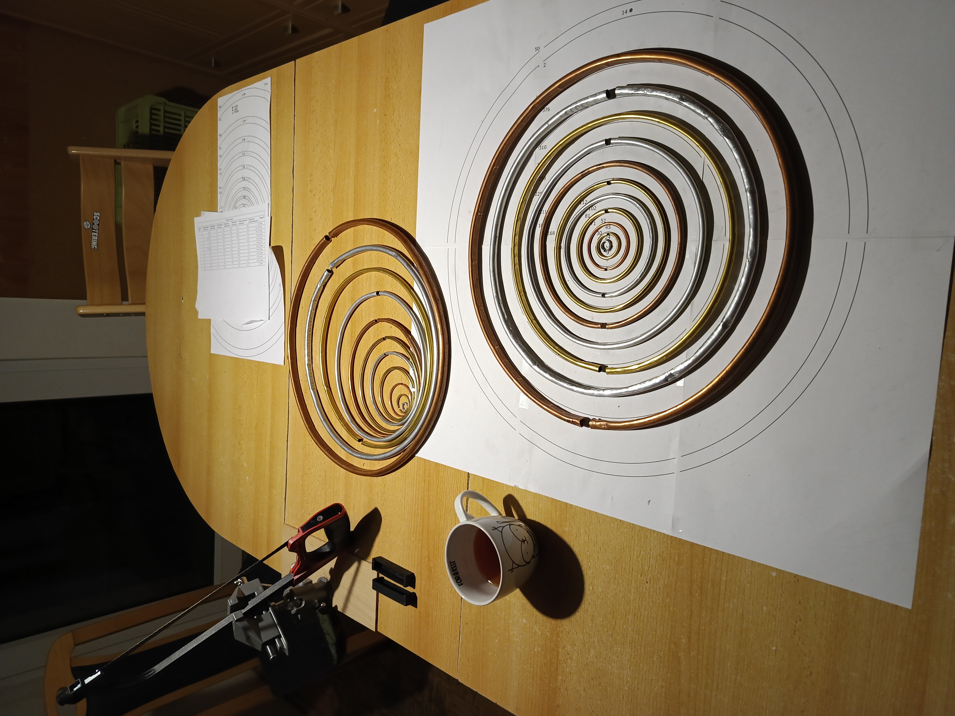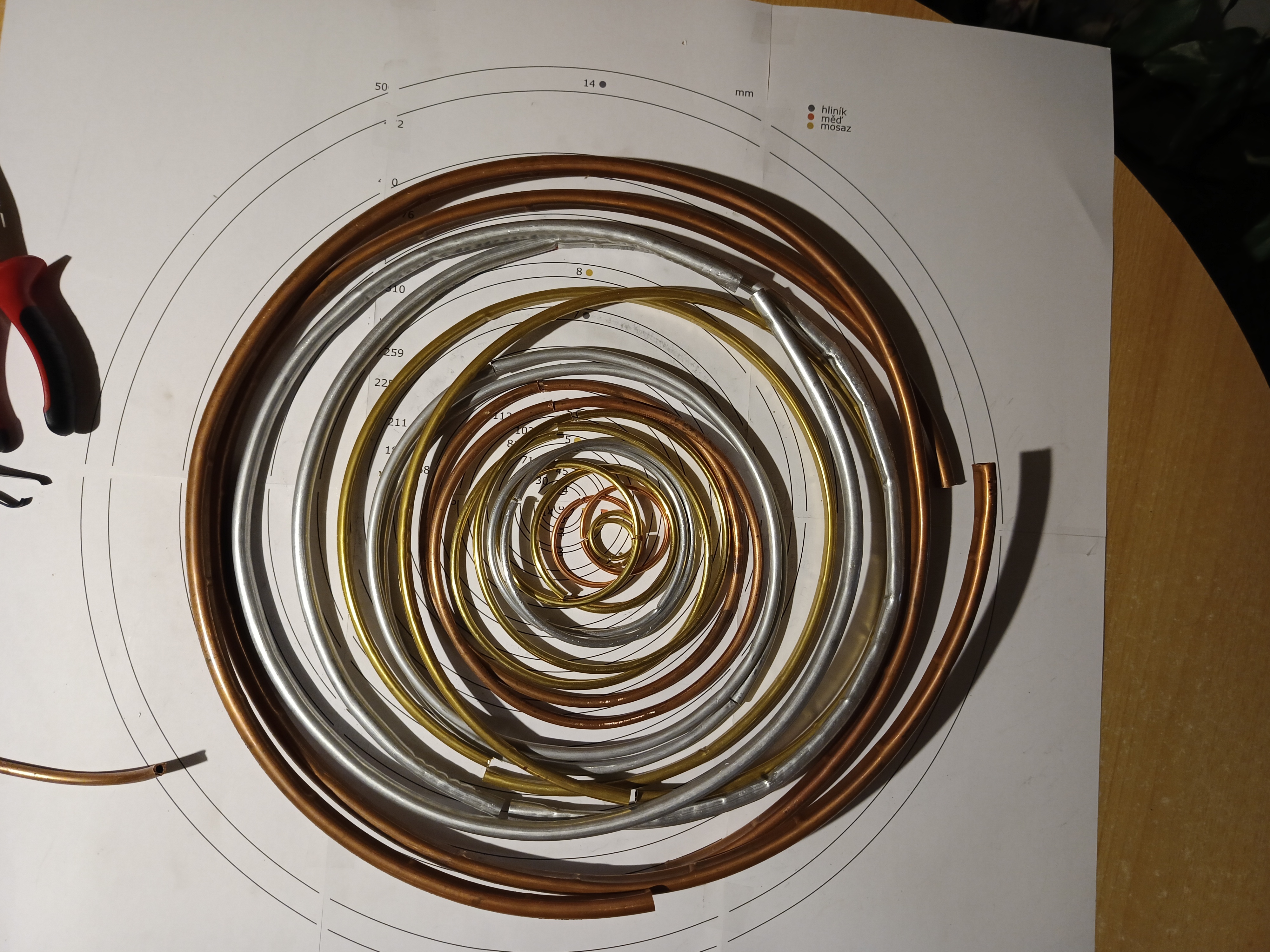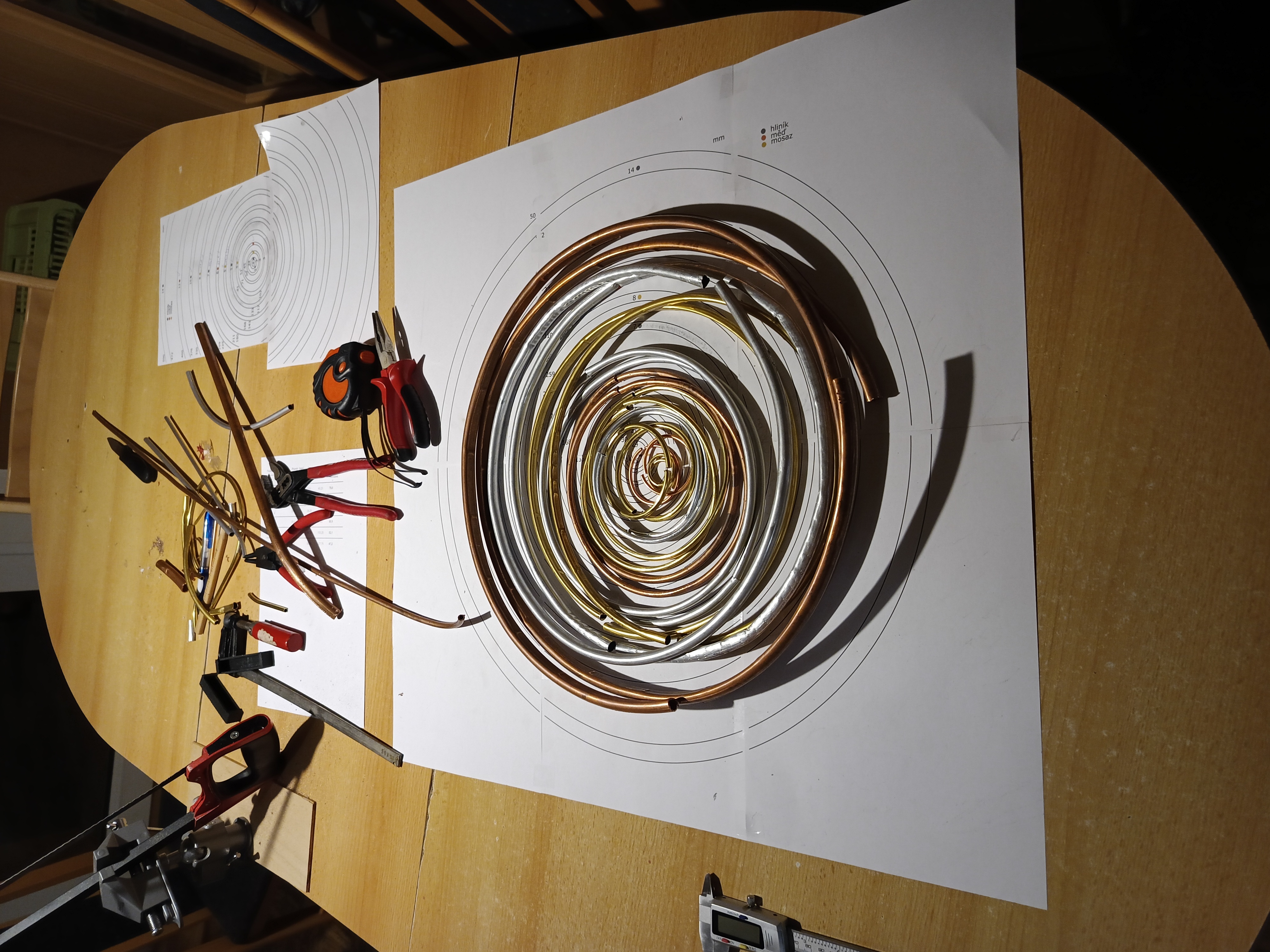 Na další kruhy jsem si koupil trojválečkovou ruční ohýbačku trubek do 7 mm průměru. Ta má na svém těle tři válečky. Dva válečky, horní a levý, jsou pevné a otáčí se proti sobě při točení klikou, třetí pravý váleček je volný a otočný pomocí šroubu kolem horního válečku. Mezi spodními a horním válečkem je ohýbaná trubka. Nejdřív jsem si udělal geometrickou předpověď, jak nastavit šroub ohýbačky, abych dosáhl požadovaného ohybu. Pak jsem zkusil Google AI, aby to taky spočítala a výsledky se trochu lišily. Použil jsem to jako počáteční nastavení, ale ukázalo se, že je ohýbání trubek spíše experimentální práce a postupně jsem se přibližoval požadovanému poloměru podle šablony, ale i tak to bylo docela obtížné. Protože trubky měly různou tvrdost, měkká i tvrdá měď a hliník, tvrdá mosaz, šlo to různě obtížně. Někdy se mi kruhy trochu deformovaly a hodně jsem je doohýbával nakonec v ruce. To ale u velkého tvrdého měděného kruhu už nešlo a tak jsem sundal z horního válečku trubkový nástavec, abych měl víc místa mezi válečky a postupně ohnul měděnou trubku.
