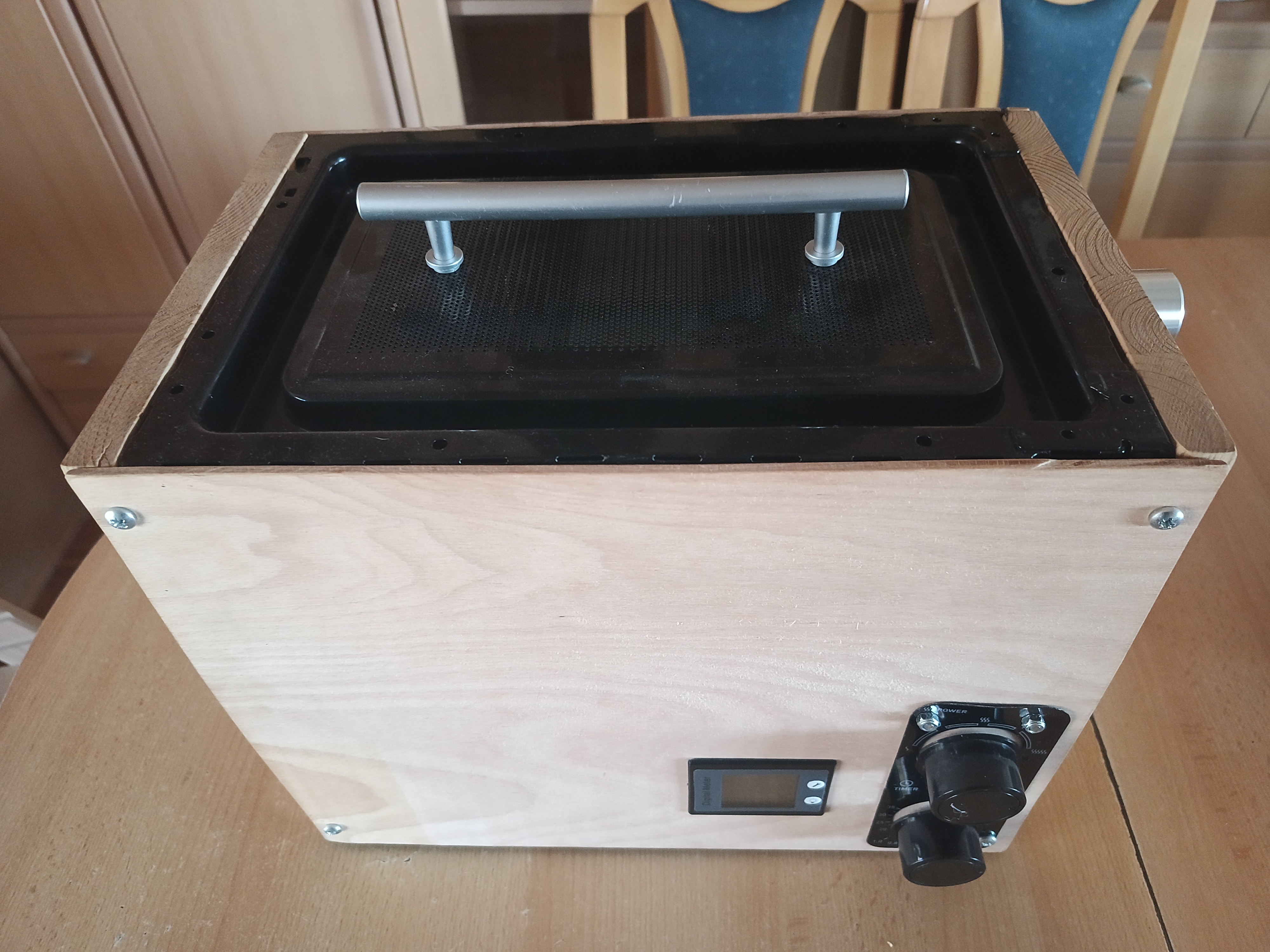 Časovač z mikrovlnné trouby má dvě části, samotné časování nastavitelné knoflíkem na čas do 35 minut a pak druhým knoflíkem se volí výkon ve 4 stupních. Uvnitř je zpřevodovaný elektromotor, který otáčením spíná a vypíná vstupní napětí na výstup. Stupně výkonu jsou řešeny tak, že na první stupeň se sepne výstup na krátkou dobu a pak zase vypne. Na druhý a třetí stupeň se sepnutí prodlužuje a na 4. stupeň je sepnuto pořád po dobu načasování.