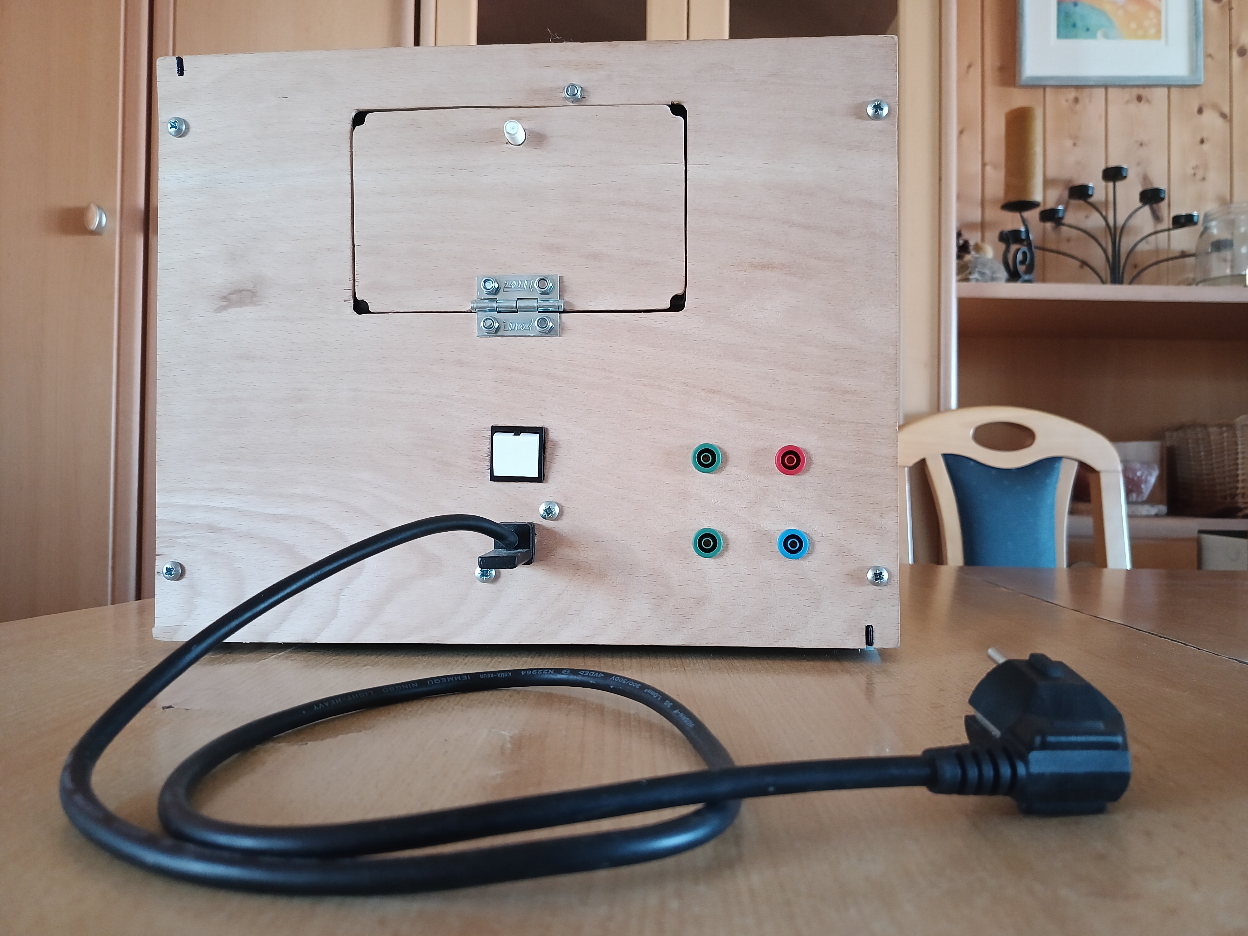 Přední a zadní panel je z dřevotřísky s vyřezanými a vyvrtanými otvory pro ovládání. Ve předu to jsou otvory časovače a elektroměru, vzadu ve spodní části otvory pro přívodní kabel, spínač, konektory vysílače a přijímače a v horní části dvířka do jiskřiště.