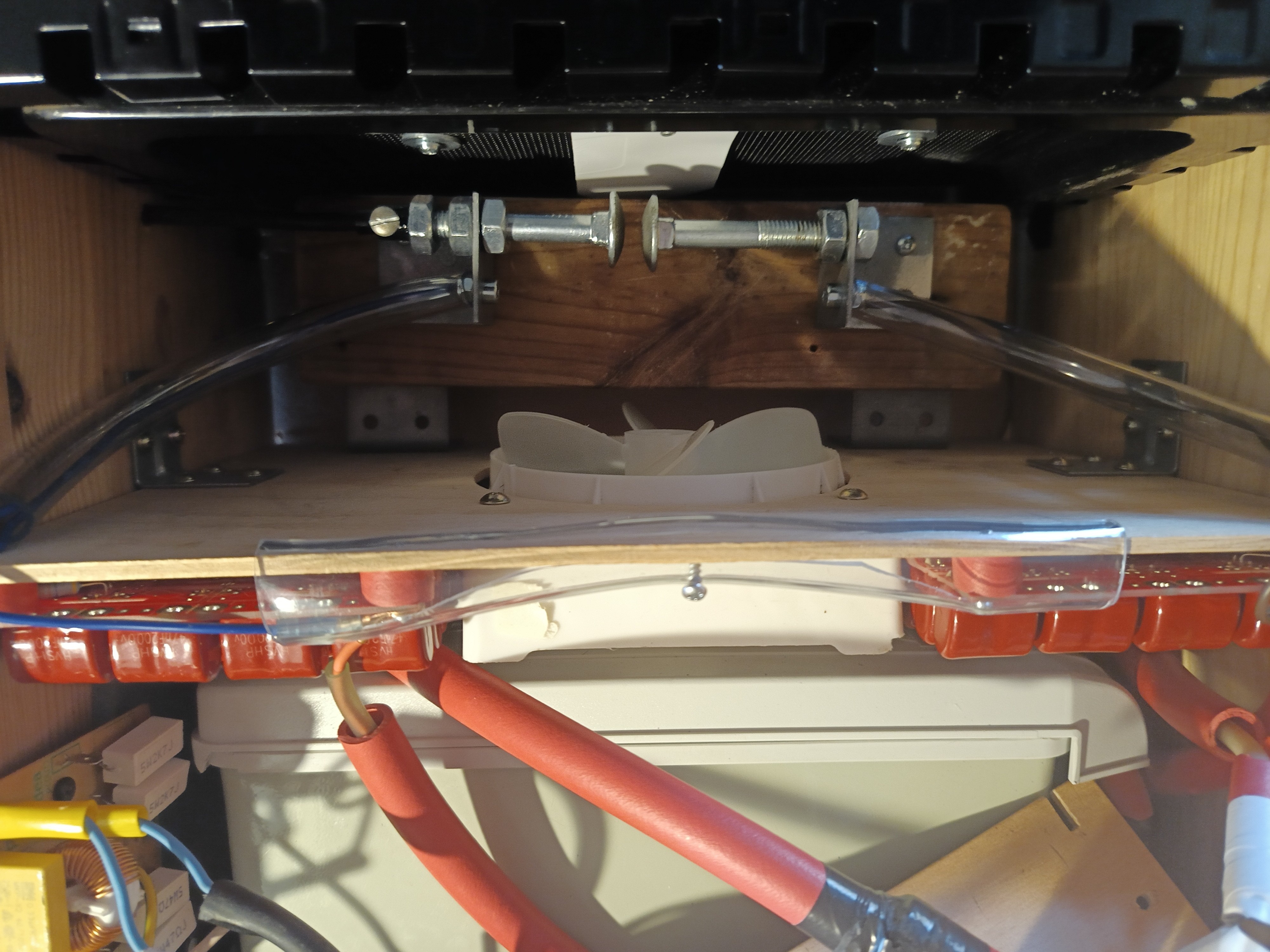 Z pokusných provozů přístroje jsem zjistil některé slabiny propojení a vylepšil ho uvnitř generátoru. Tady je dobré mít řádnou izolaci všech vodičů a u těch pod vysokým napětím jsem je obalil do plastových a gumových trubic o průměru kolem 1 cm, vylepšil všechna koncová připevnění, aby byla pevně přišroubována bez volných mezer, kde by docházelo k jiskření a postupnému propálení. Šrouby jiskřiště se dost při jiskření zahřívají, tak je dobré myslet na to a mít pojištěné přilepené matice ve dvojicích a utažené, aby i když lepidlo povolí, pořád vše dobře šrouby jiskřiště drželo na místě.