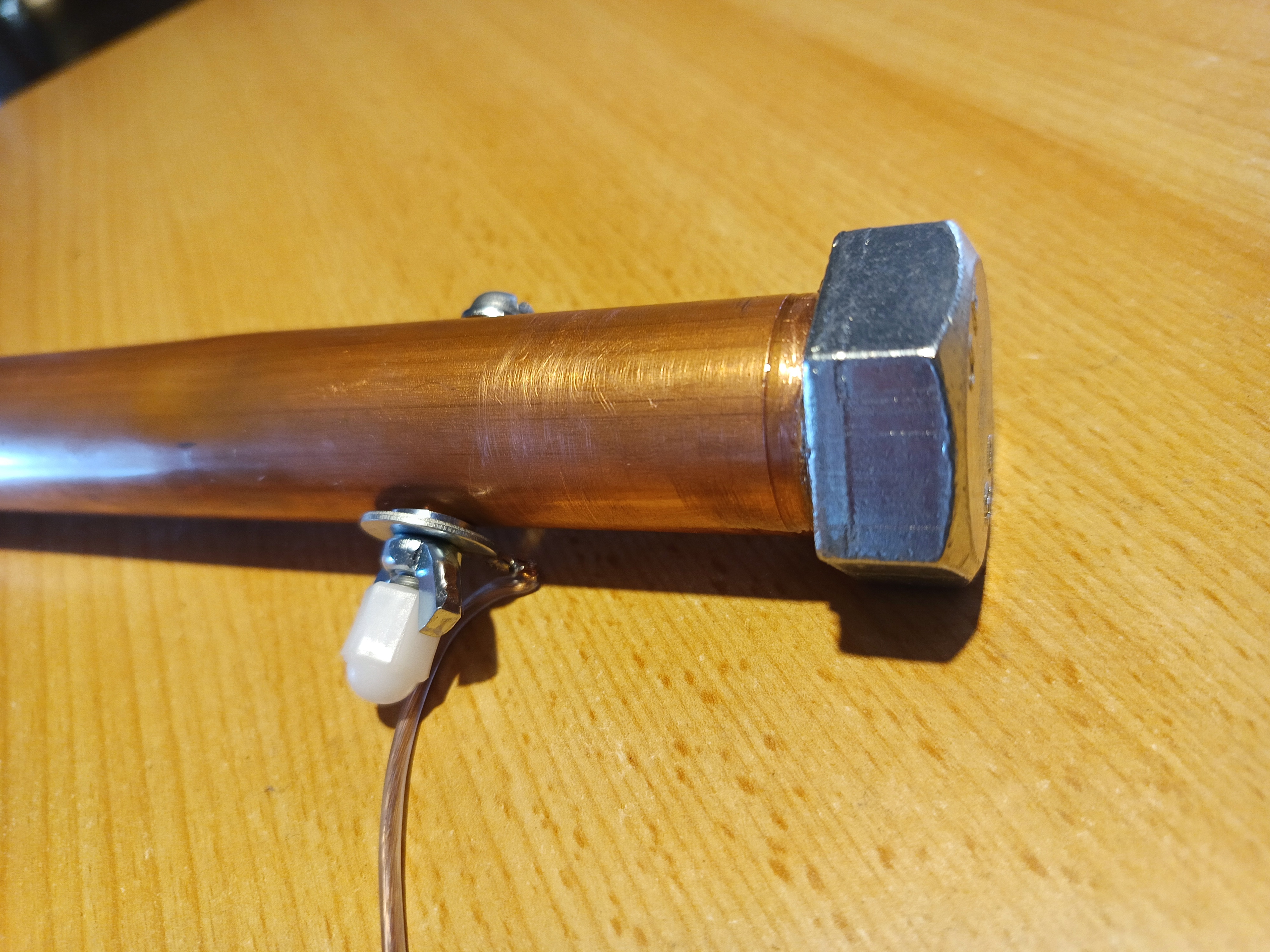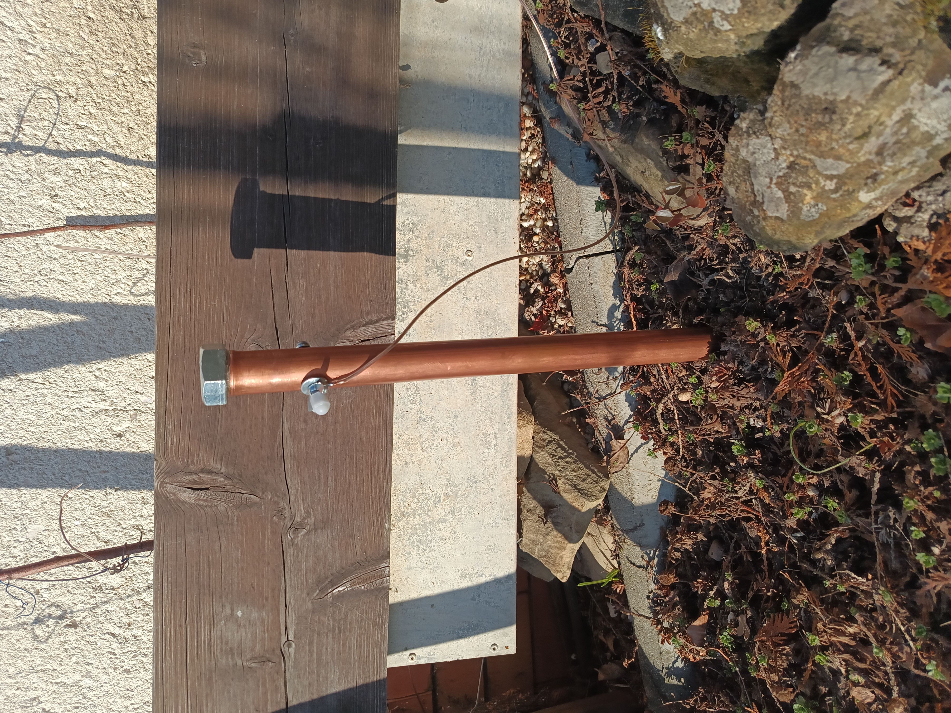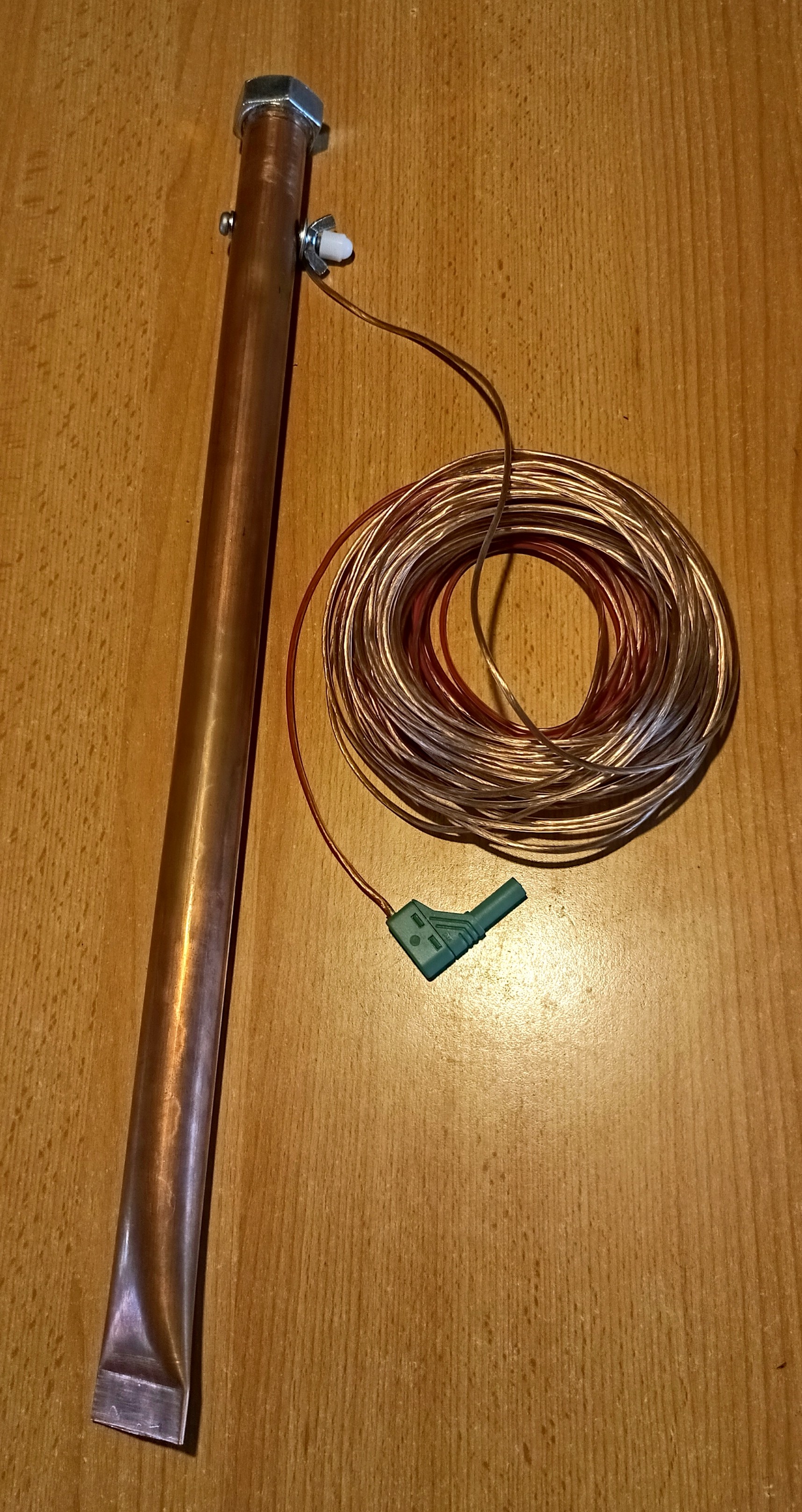 Nakonec jsem si připravil dlouhý drát s konektorem do uzemňovací zdířky na generátoru, která je spojená vodičem s přívodem antén, který jsem ale musel uvnitř odpojit od země elektrického vedení, což vyžadovalo jistou přestavbu propojení. Na druhý konec dlouhého izolovaného drátu jsem připájel podložku. Připravil jsem si asi půlmetrovou měděnou trubku o průměru 2,5 cm, na jednom konci ji secvaknul ve svěráku do plošky a tím uzavřel pro zatlučení do země, na druhém konci jsem vyvrtal napříč díru pro šroub a pomocí podložek a matice připevnil k trubce i koncovou podložku drátu. Na otevřený konec trubky jsem koupil velký šroub, který jsem do otvoru zalepil a který mi slouží jako nárazník pro zatlučení kolíku do země, čímž jsem získal druhé nezávislé uzemnění antén.