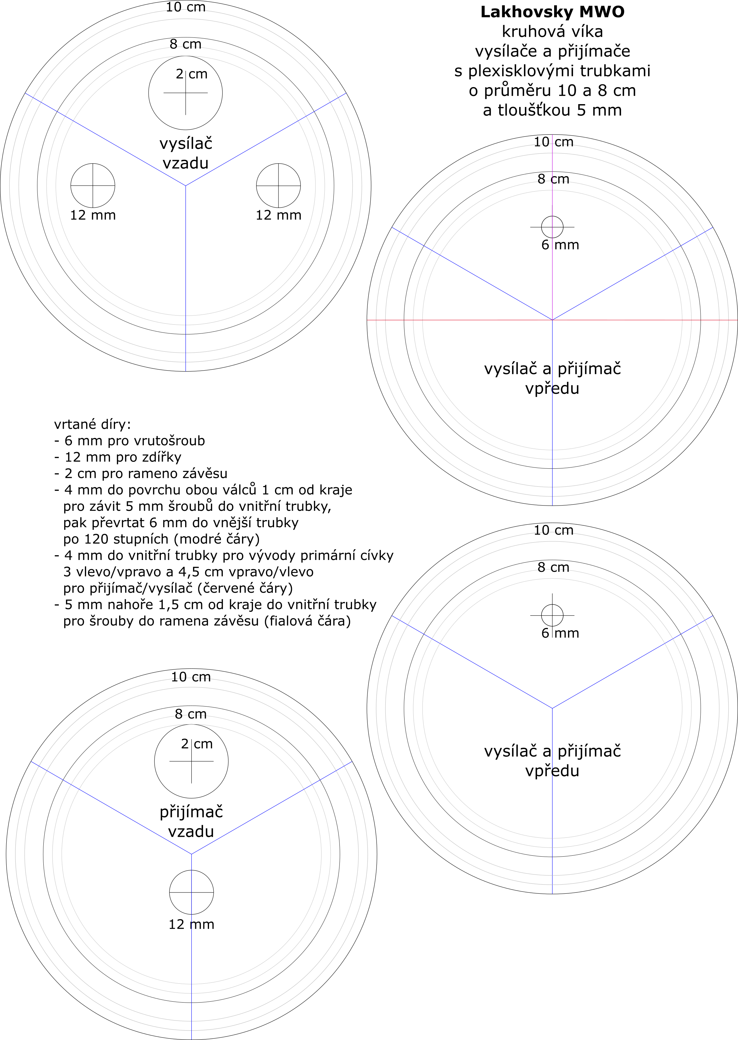 Každý se skládá ze dvou plexisklových trubek, užší vnořené do širší, a dvou plexisklových kruhových vík. Nachystal jsem je podle tohoto pomocného nákresu. Jsou v něm popsané díry vrtané pro různé účely.
