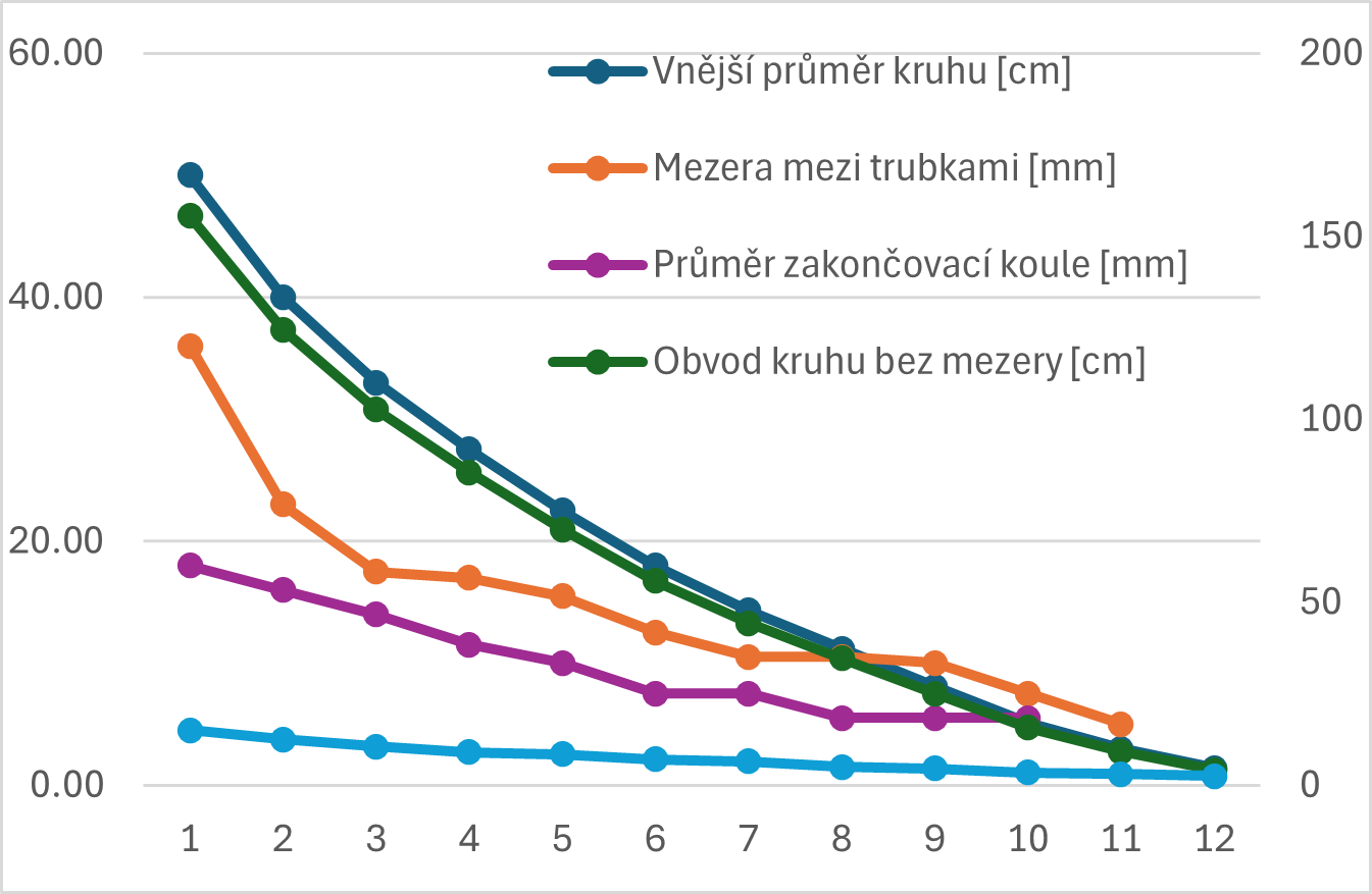 | Anténa číslo | Vnější průměr kruhu [cm] | Vnější průměr trubky [mm] | Vnitřní průměr kruhu [cm] | Mezera mezi trubkami [mm] | Vnější obvod kruhu [cm] | Průměr zakončovací koule [mm] | Mezera mezi koulemi/konci [mm] | Materiál 2) |