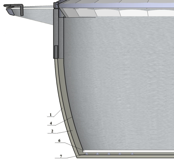Spodní část, která by reagovala dostatečně na indukci, by měla být z nemagnetického materiálu, aby se v ní neindukovalo teplo. Doporučujeme udělat celý vnější plášť ze skla (číslo 1 na řezu).